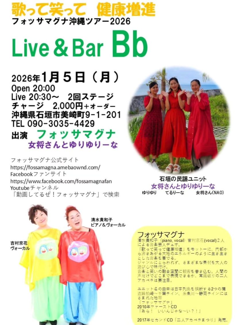 ★フォツサマグナ沖縄ツアー2026・開場:20時/開演:20時30分・出演=フォツサマグナ、女将さんとゆりゆりーな・会場=石垣市 Bar Bb(石垣市美崎町 9-10-2)