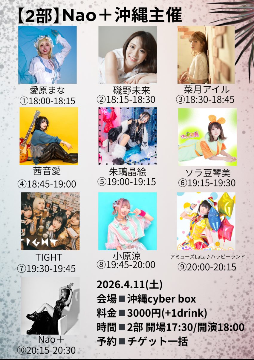 ★Nao+沖縄主催2026【2部】・開場:17時30分/開演:18時・出演=Nao+ / 小原涼 / 磯野未来 / 菜月アイル / 茜音愛 / アミューズLaLa♪ハッピーランド / 愛原まな / 朱璃晶絵 / TIGHT・会場=Cyber-Box