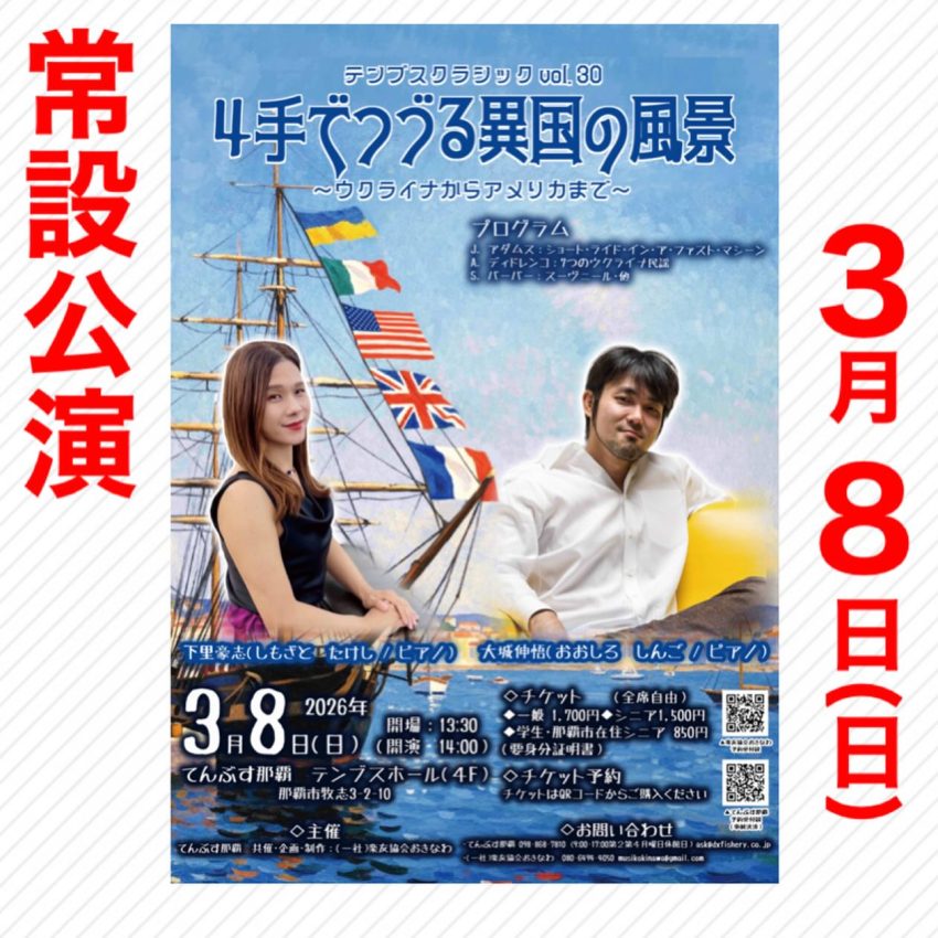 ★てんぶすクラシックvol.30・4手でつづる異国の風景 〜ウクライナからアメリカまで〜・開場:13時30分/開演:14時・出演=下里豪志(しもざとたけし:クビア)、大城伸悟(おおしろ しんご:ビアノ)・会場=てんぶす那覇・テンブスホール