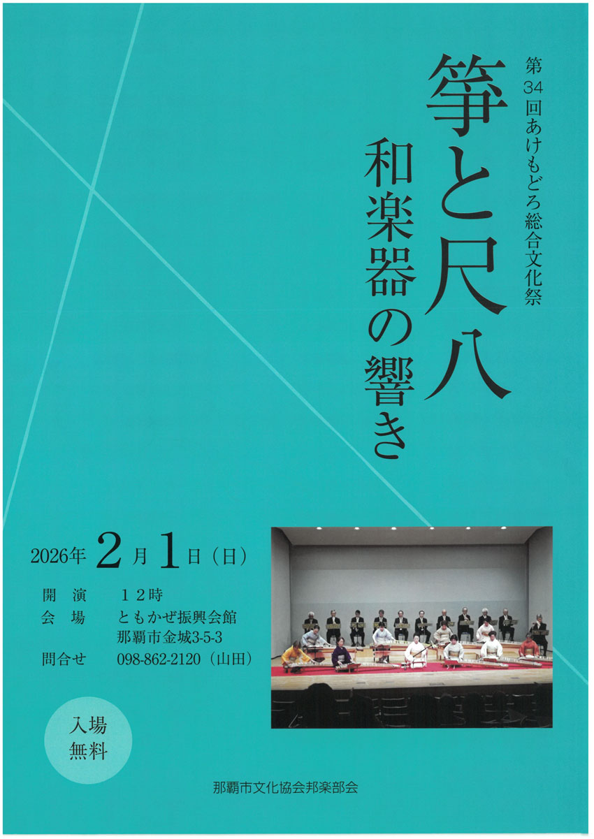 ★那覇市文化協会・第34回 あけもどろ 総合文化祭・邦楽部会『箏と尺八和楽器の響』・開演:12時・会場=ともかぜ振興会館(那覇市金城3丁目5番地3)
