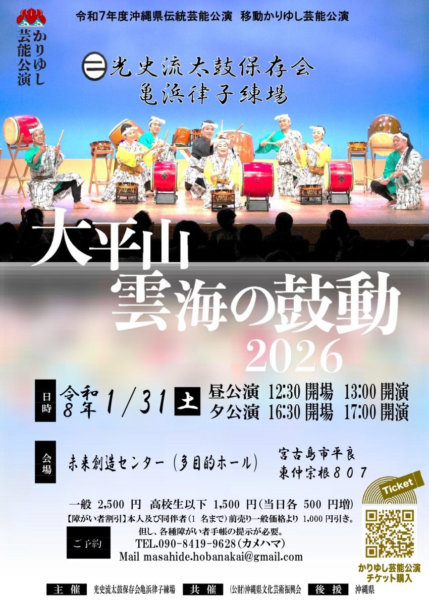 ★光史流太鼓保存会亀浜律子練場 「大平山・雲海の鼓動2026」・【お昼の部】開演:13時・【夕方の部】開演:17時・会場=宮古島市未来創造センター・多目的ホール
