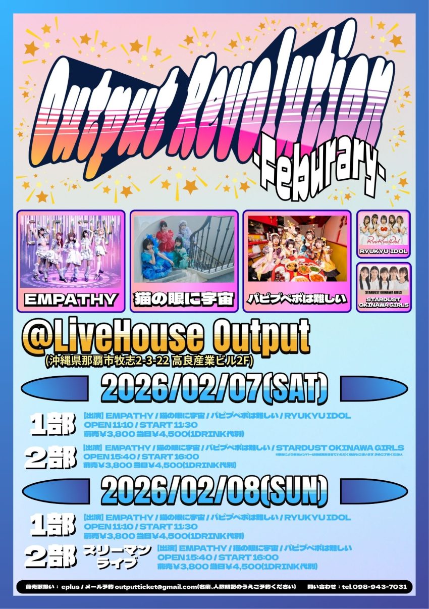 ★Output Revolution -Feburary- ・【1部】開場:11時10分/開演:11時30分・出演=RYUKYU IDOL、猫の眼に宇宙、EMPATHY、パピプペポは難しい・【2部】開場:15時40分/開演:16時・出演=STARDUST OKINAWA GIRLS、EMPATHYmパピプペポは難しい、猫の眼に宇宙・会場=ライブハウスoutput