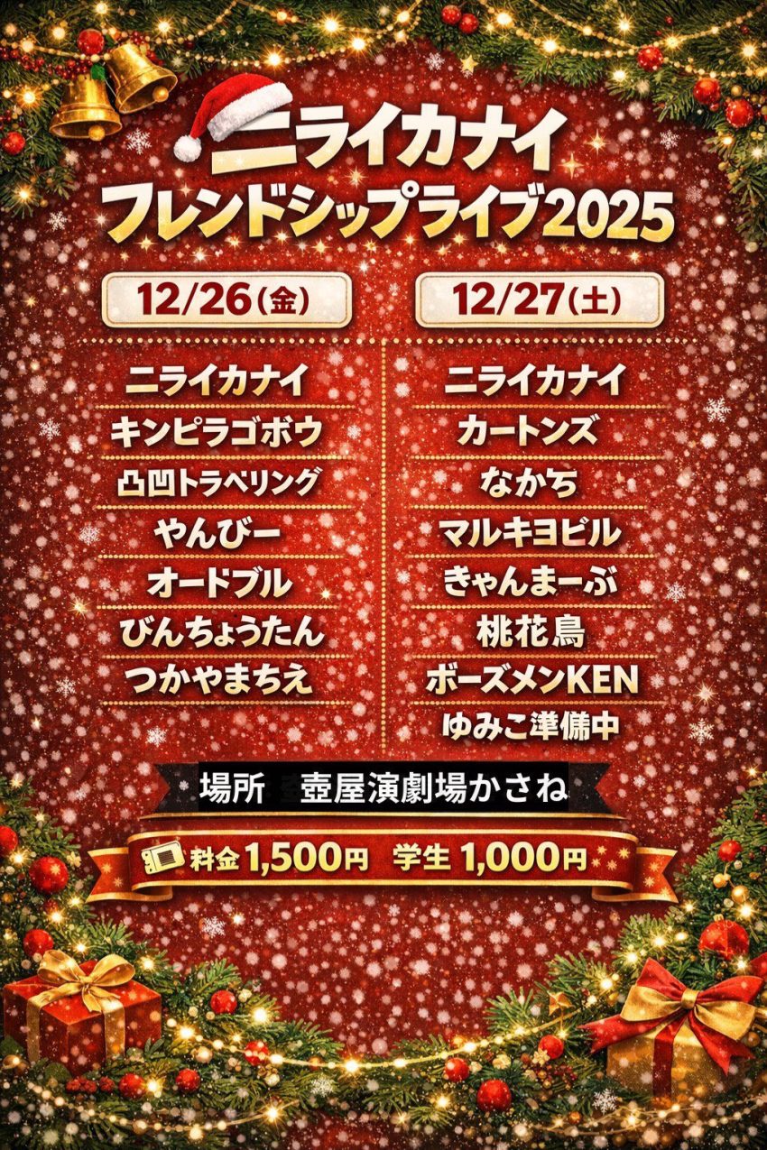 ★ニライカナイフレンドシップ ライブ2025・開場:19時/開演:19時30分・出演=ニライカナイ、キンピラゴボウ、凸凹トラベリング、やんびー、オードブル、びんちょうたん、つかやまちえ・会場=壺屋演劇場かさね
