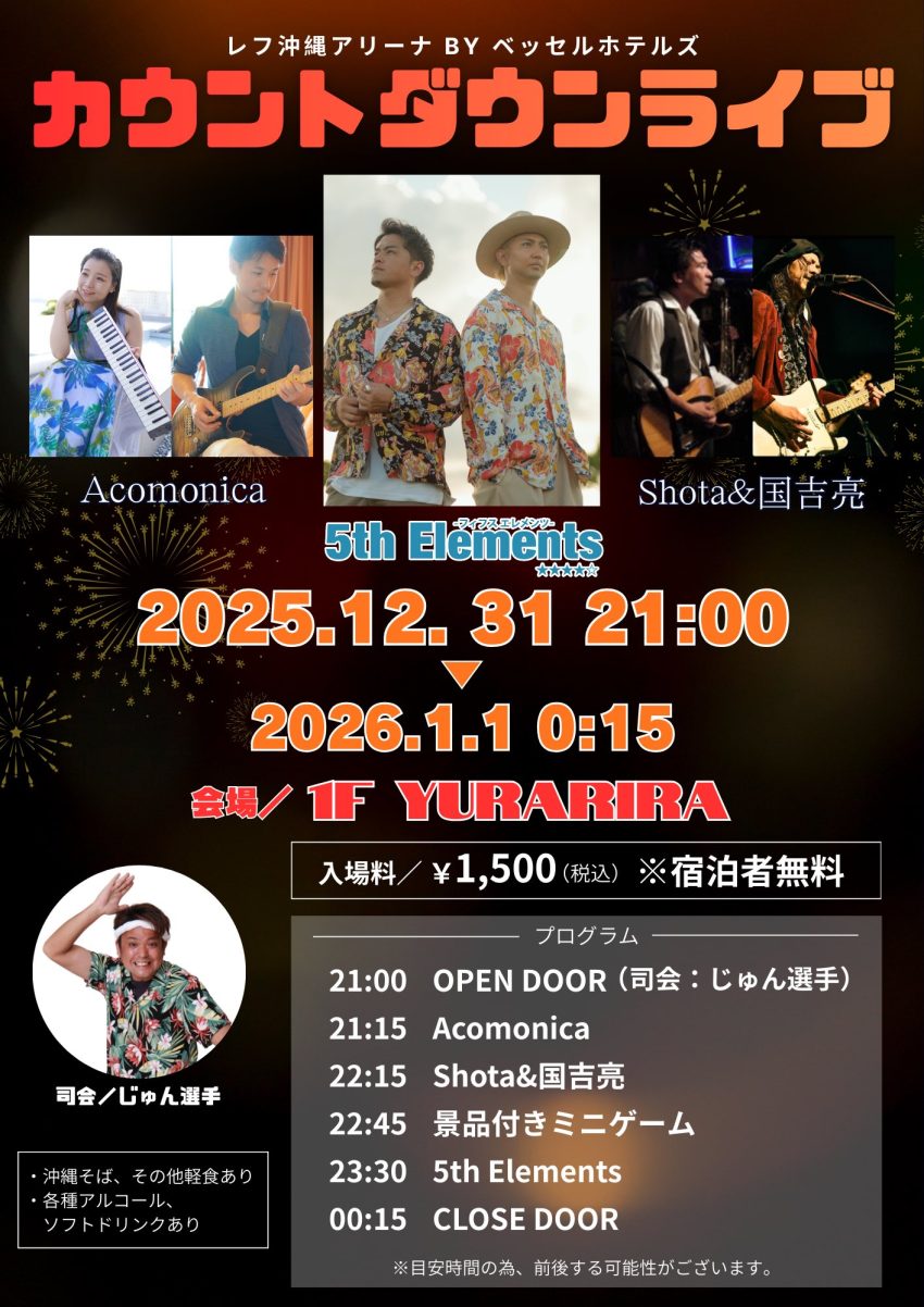 ★カウントダウンライブ・21時~24時15分・出演=Acomonica、5th Elements、Shota&国吉亮・会場=レフ沖縄アリーナ BY ベッセルホテルズ