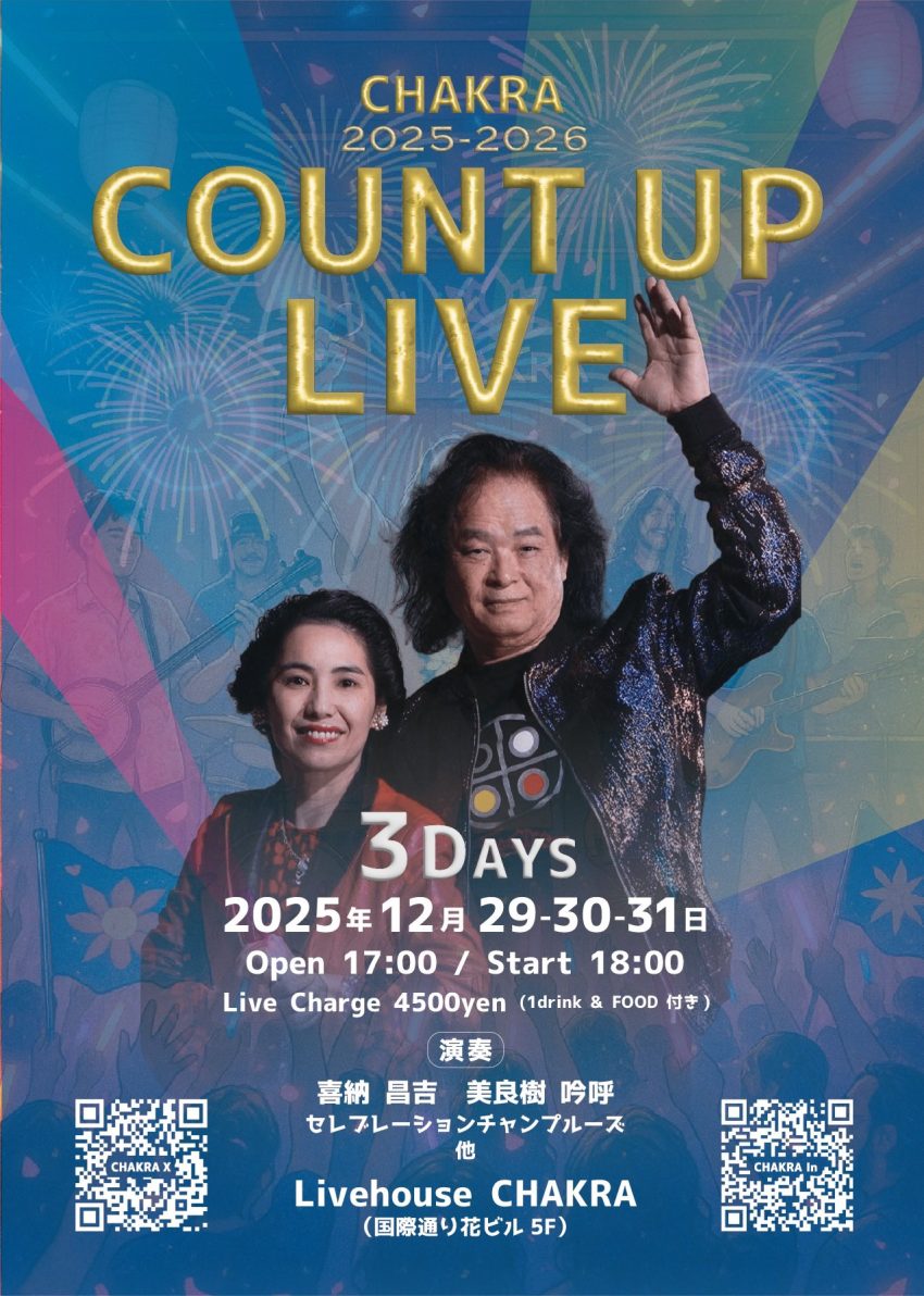 ★喜納昌吉 CHAKRA COUNT UP LIVE・開場:17時/開演:18時・演奏:喜納昌吉、美良樹 吟呼、セレブレーションチャンプルーズ他・会場=Livehouse CHAKRA(国際通り花ビル 5F)