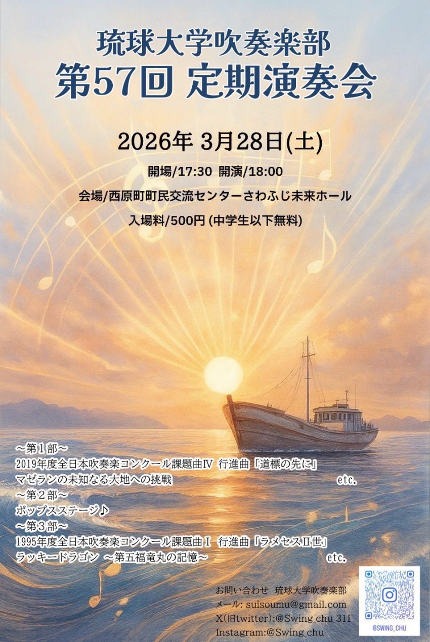 ★琉球大学吹奏楽部 第57回定期演奏会・開場:17時30分/開演:18時・会場=西原町町民交流センターさわふじ未来ホール