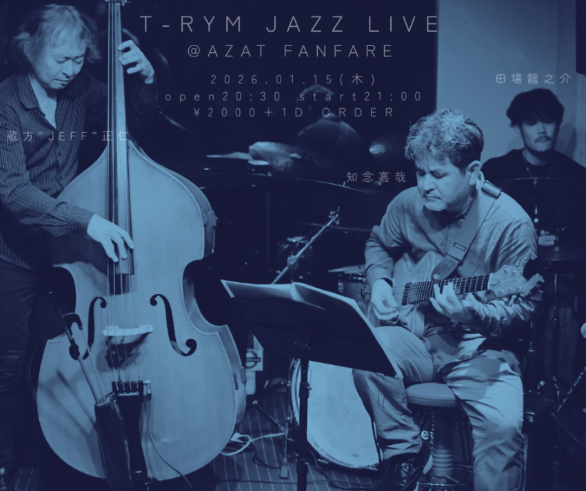 ★T-RYM JAZZ LIVE・開場:20時30分/開演:21時・出演=知念嘉哉(guitar) 蔵方”JEFF”正仁(bass) 田場龍之介(drums)・会場=AZAT FANFARE