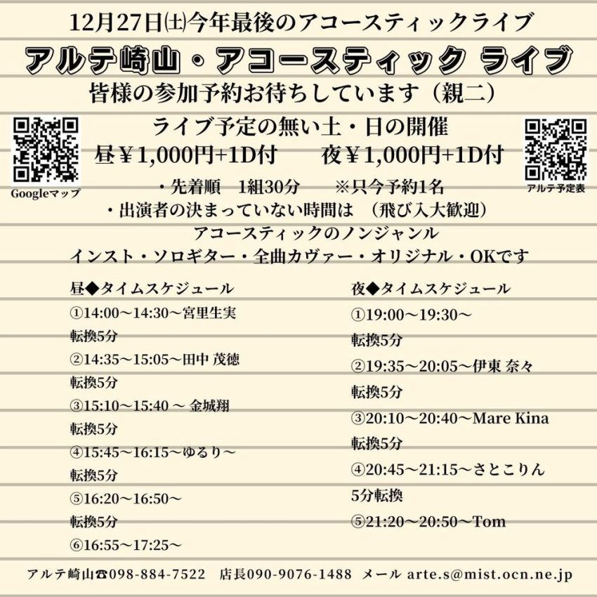 ★アルテ・アコーステック ライブ (昼)・開場:13時/開演:13時30分・出演=宮里生実、田中茂徳、金城翔、ゆるり・会場=アルテ山崎