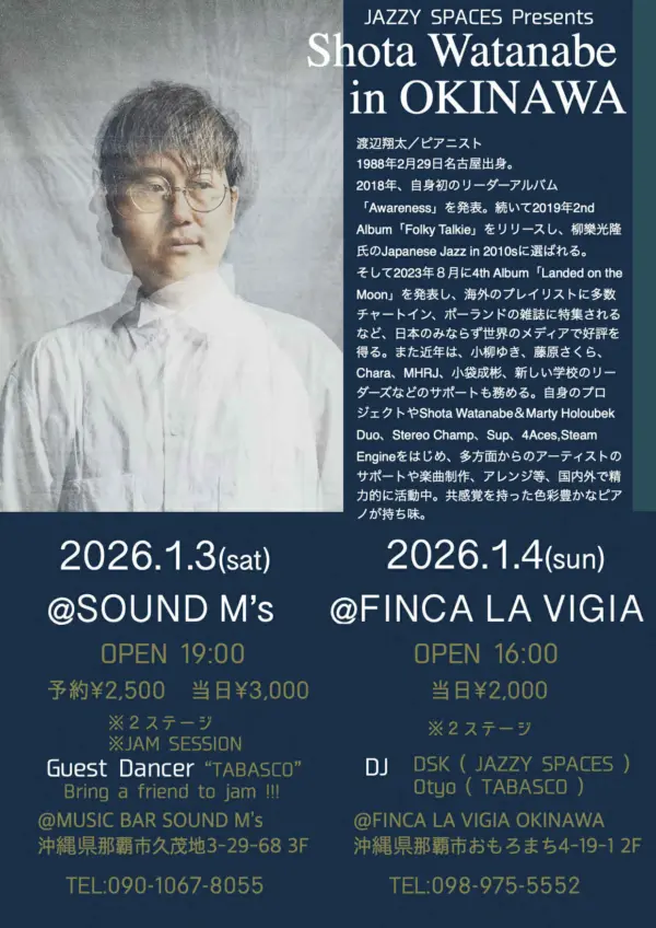 ★渡辺翔太/Shota Watanabe in Okinawa・開場:19時/開演:19時・MEMBER=渡辺翔太(piano)・Guest Dancer”Tabasco”・会場=Live Music Bar SOUND M’S