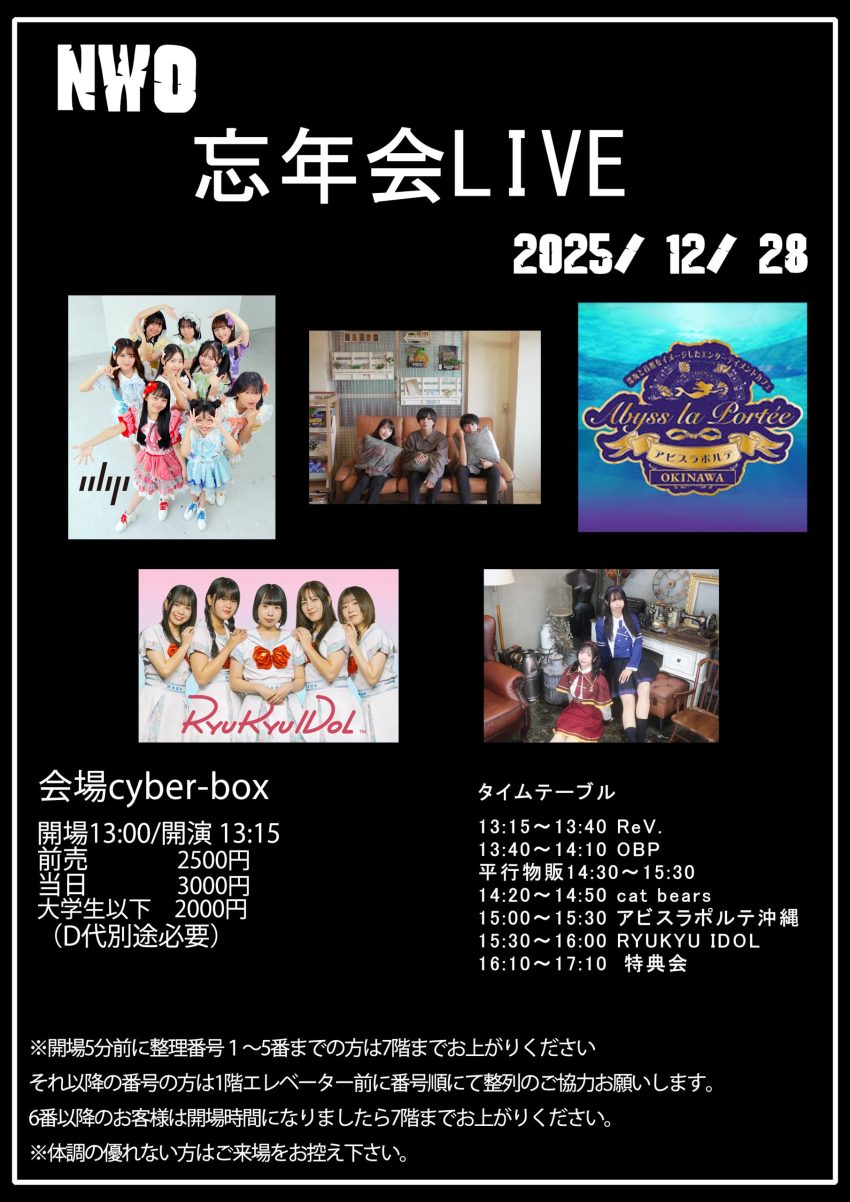★NWO忘年会LIVE・開場:13時/開演:13時・出演=OBP、ReV.RYUKYU IDOL、アビスラポルテ沖縄、cat bears・会場=Cyber-Box