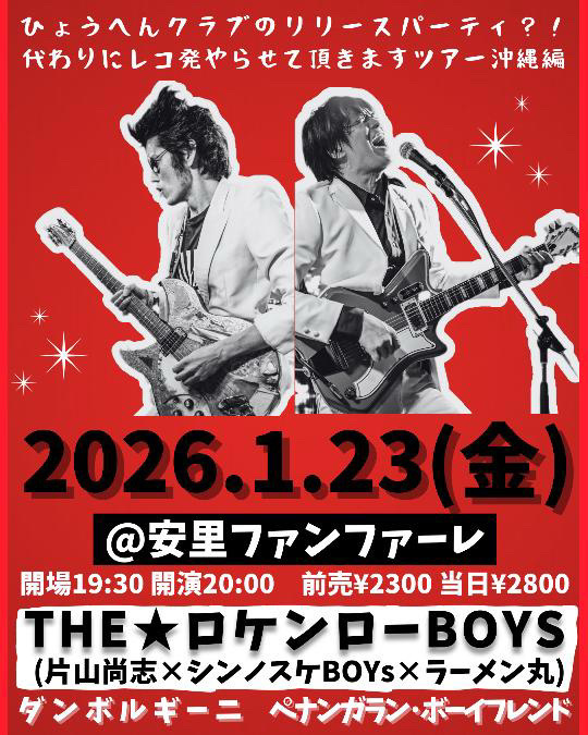 ★ひょうへんクラブのリリースパーティ?!代わりにレコ発やらせて頂きますツアー💿沖縄編』・開場:18時30分/開演:19時・LIVE:虐げられた民、THE ABOUTIE’S、SHOCKING桃色、THE☆ロケンローBOYS(片山尚志×シンノスケBOYs×ラーメン丸)・会場=ABD RECORD’S BAR(那覇市久米2-6-7 プラザエポックビル205)