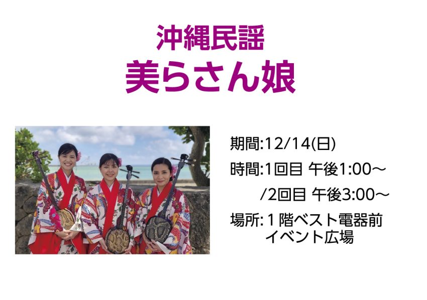 ★沖縄民謡 美らさん娘・【1回目】開演:13時~・【2回目】開演:15時~・会場=イオン名護店1階ベスト電器前イベント広場