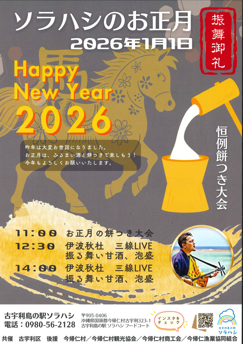 ★ソラハシのお正月・12時30分~&14時:伊波秋杜三線LIVE・会場=古宇利島の駅 ソラハシ(今帰仁村古宇利323−1)