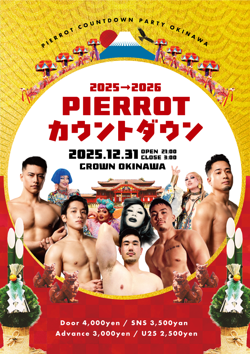 ★PIERROT カウントダウン 2025 MIX PARTY・Open:20時~Close:3時・DJ:SaMMie、shun、shinko・GOGOBOY:TAISHI (tokyo)、SHOTA (tokyo)、KOSE (tokyo)、TAKI、MIKIYA・Drag Queen:のぼる.co (tokyo)、KOTSTMI (tokyo)、レディーバブリシャス (NAGOYA)、山田さん、L’espelanza、丸市ミー子、アブラマミレ、クロレラDルド、ボンバーナ・DANCER:YU、SHOTA、MUSASHI、CHOTA、DAIKI、TAIKI、EITO、EITO、TAIKI・会場=クラウン(那覇市松山2-15-8)