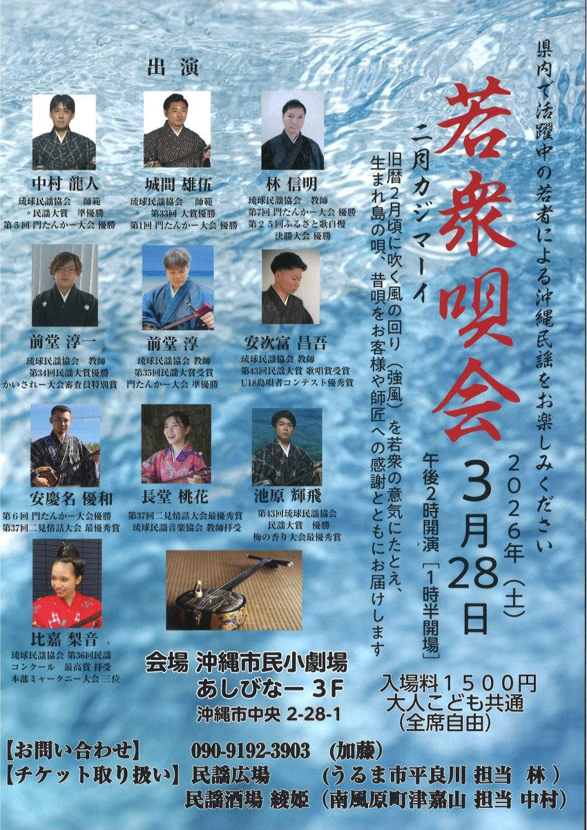 ★若衆唄会・二月カジマーイ・開場:13時30分/開演:14時・出演=中村龍人、城間雄伍、林信明、前堂淳一、前堂淳、安次富昌吾、安慶名優和、長堂桃花、池原輝飛、比嘉梨音・会場=沖縄市民小劇場あしびなー