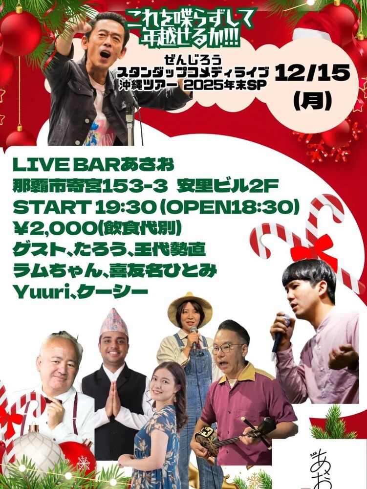 ★ぜんじろう 沖縄ツアー2025年末SP・開場:18時30分/開演:19時30分・ゲスト=たろう、玉代勢直、ラムちゃん、喜友名ひとみ、Yuuri、ケーシー・会場=LIVE BAR あさお