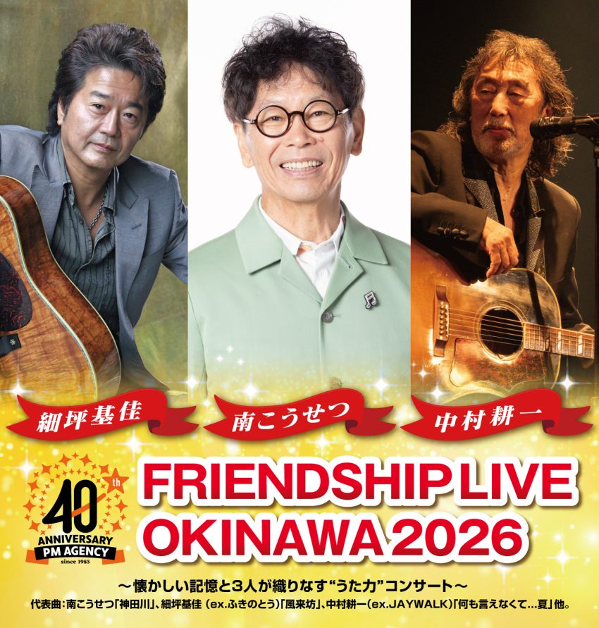 ★ビーエムエージェンシー 40th Anniversary・FRIENDSHIP LIVE OKINAWA 2026・開場:15時30分/開演:16時30分・出演=南こうせつ / 細坪基佳 / 中村耕一・会場=沖縄コンベンションセンター劇場棟