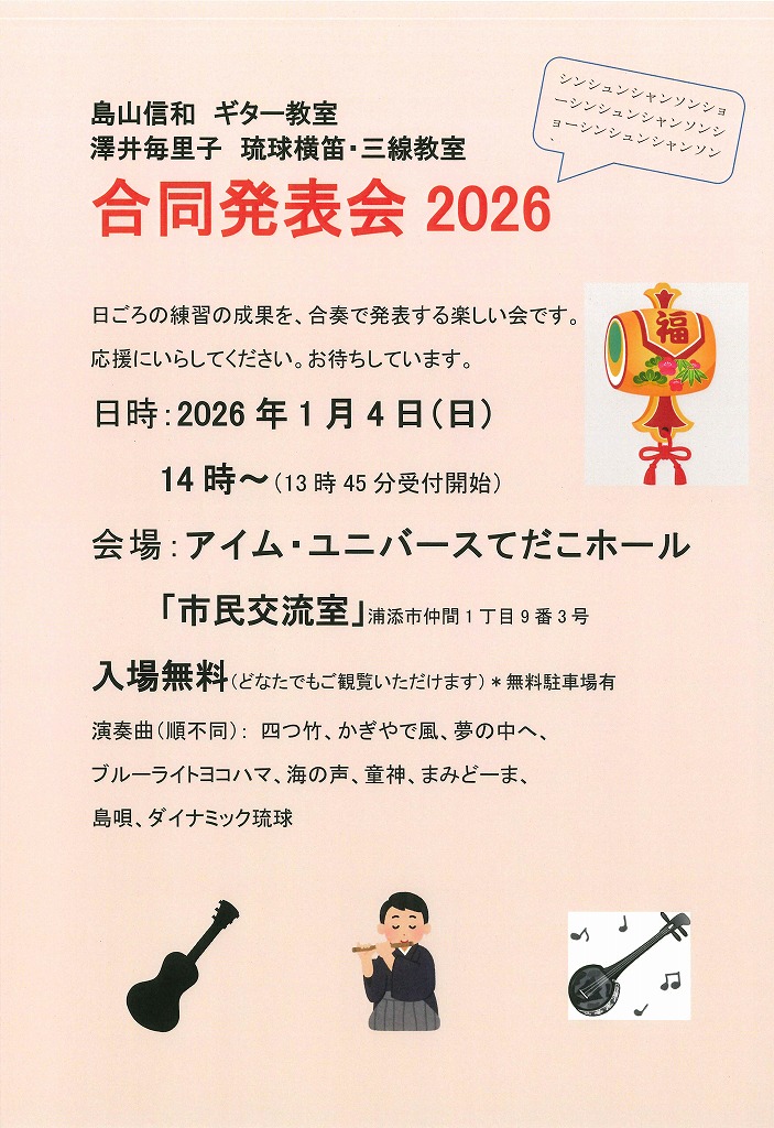 ★島山信和 ギター教室 澤井毎里子 琉球横笛·三線教室 合同発表会 2026・受付開始:13時45分時/開演:14時・会場=アイム・ユニバースてだこホール・市民交流室