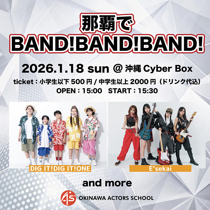 ★那覇でBAND!BAND!BAND!・開場:15時/開演:15時30分・出演者=DIG IT!DIG IT!ONE、E’sekai・OPENING ACT=Noah、ゆなき、andmore・会場=沖縄CYBERBOX(那覇市松山1丁目32−5 むらたビル 7F)