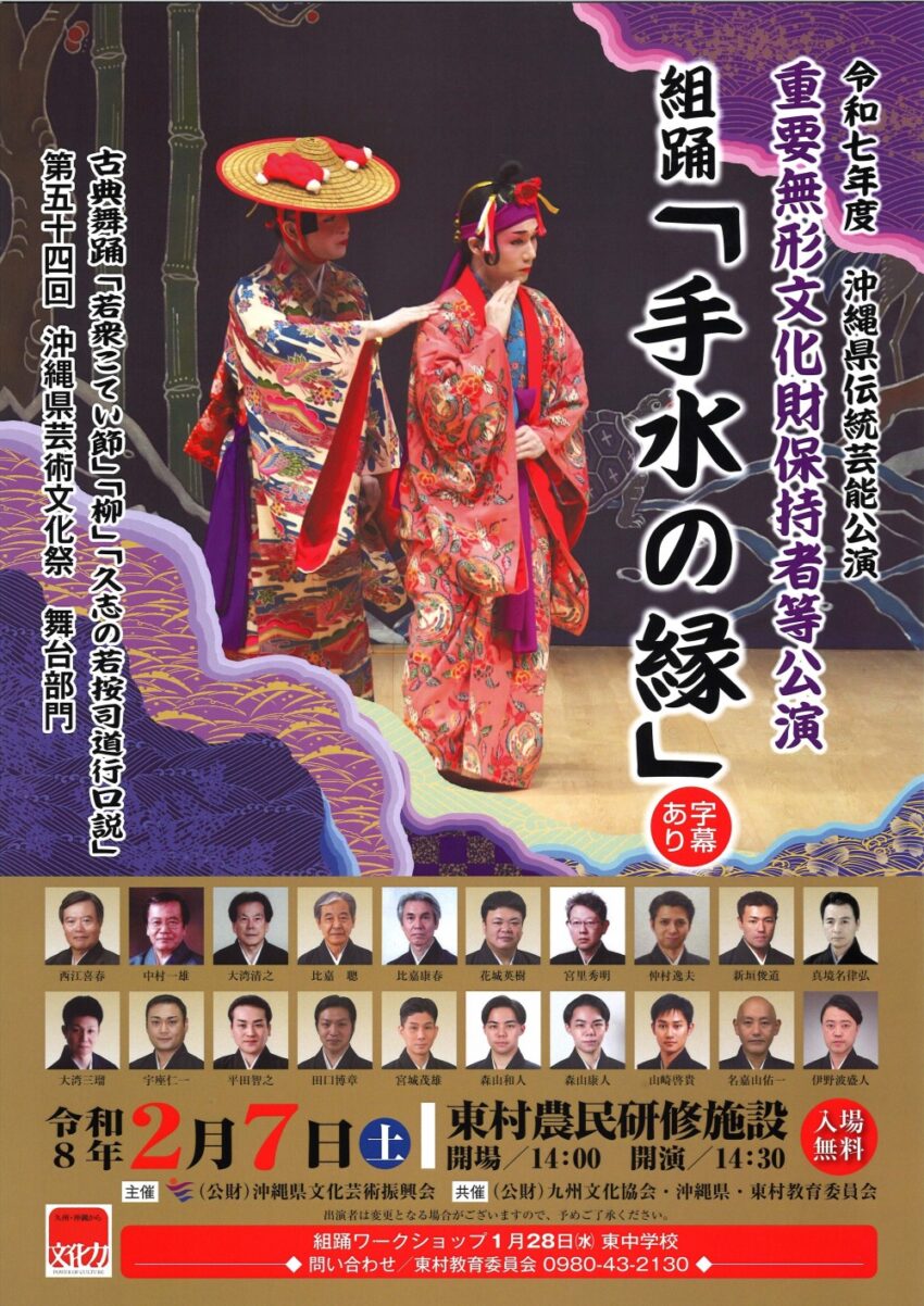 ★重要無形文化財保持者等公演 令和七年度 沖縄県伝統芸能公演 組踊「手水の縁」字幕あり・開場:14時/開演:14時30分・出演=西江喜春、中村一雄、大湾清之、比嘉聰、比嘉康春、花城英樹、宮里秀明、仲村逸夫、新垣俊道、真境名律弘、大湾三瑠、宁座仁一、平田智之、田口博章、宮城茂雄、森山和人、森山康人、山崎啓貴、名嘉山佑、伊野波盛人・会場=東村農民研修施設(東村平良550−4)
