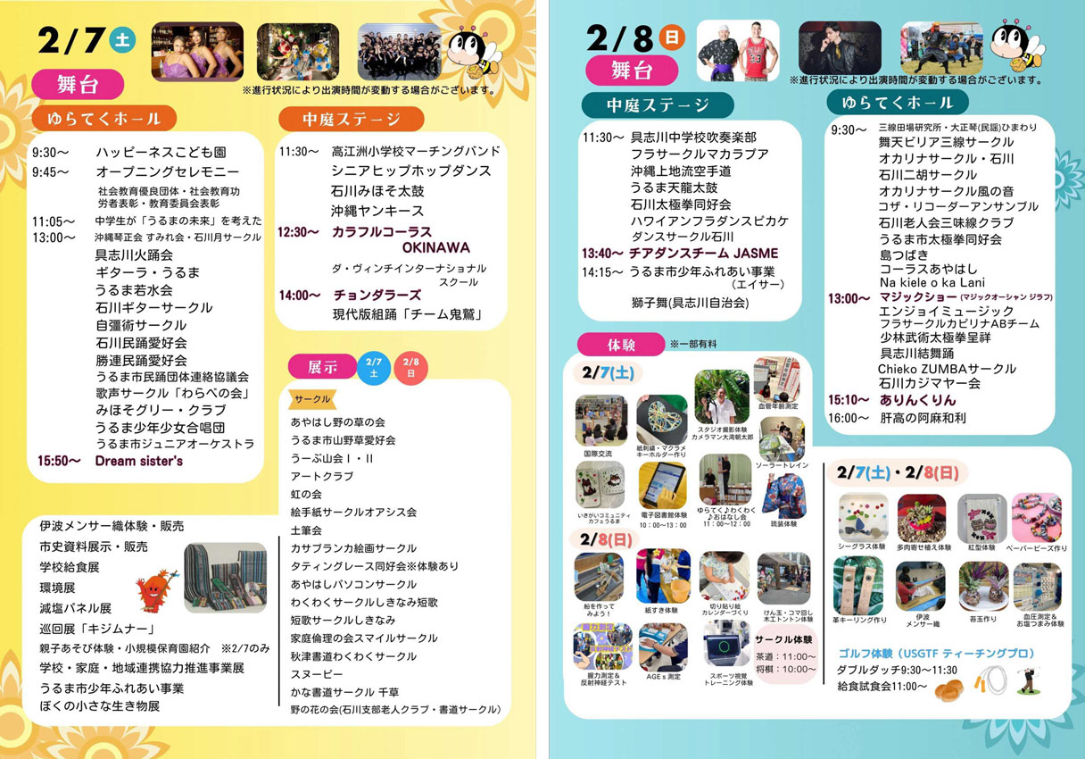 ★第21回うるま市生涯学習フェスティバル・主な出演者=13時40分~;チアダンスチーム JASME/ゆらてくホール・13時~:マジックショー(マジックオーシャンシラフ)・15時10分~:ありんくりん/中庭ホール・会場=生涯学習・文化振興センターゆらてく(うるま市仲嶺187)