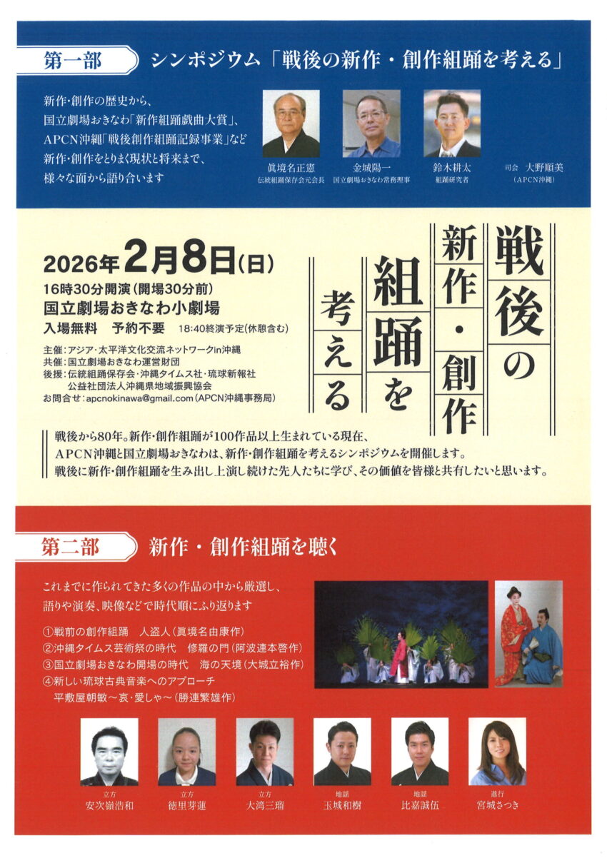 ★戦後の新作・創作組踊を考える・開場:16時/開演:16時30分~終演:18時40分・第一部=シンポジウム「戦後の新作・創作組踊を考える」:眞境名正憲、金城陽一、鈴木耕太・司会:大野順美・第二部=新作・創作組踊を聴く:安次嶺浩和、徳里芽蓮、大湾三瑠、玉城和樹、比嘉誠伍、宮城さつき・会場=国立劇場おきなわ・小劇場