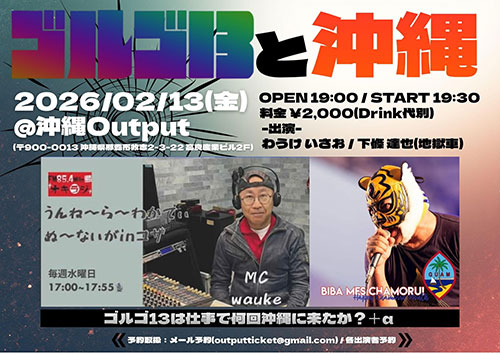 ★ゴルゴ13と沖縄 ゴルゴ13は仕事で何回沖縄に来たか?+α・開場:19時/開演:19時30分・出演=わうけ いさお、下條 達也(地獄車)・会場=ライブハウスoutput