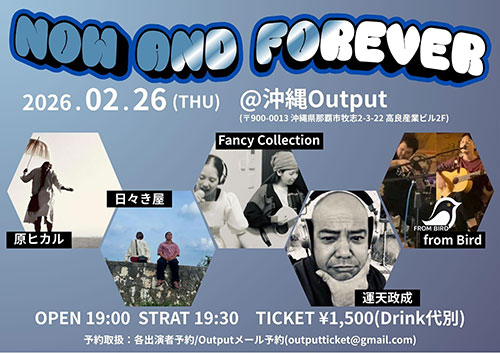 ★NOW AND FOREVER・開場:19時/開演:19時30分・出演=原ヒカル、日々き屋、Fancy Collection、運天政成/from Bird・会場=ライブハウスoutput