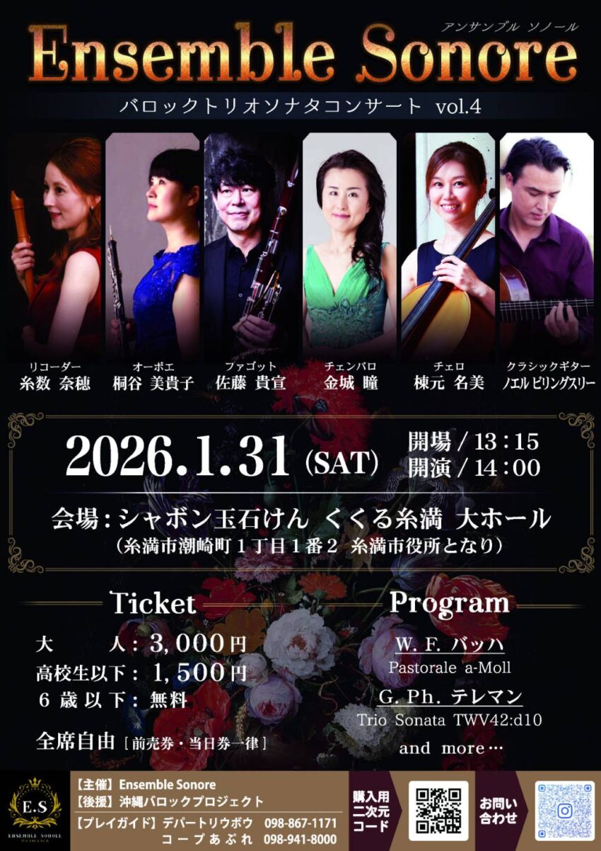 ★アンサンブルソノール バロックトリオソナタコンサート・開場:13時15分/開演:14時~終演:16時・出演=リコーダー:糸数奈穂、オーボエ:桐谷美貴子、ファゴット:佐藤貴宣、チェンバロ:金城瞳、チェロ:棟元名美、クラシックギター:ノエル ビリングスリー・会場=シャボン玉石鹸くくる糸満