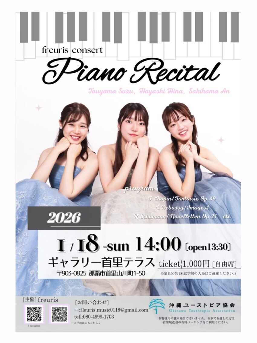 ★𝒇𝒍𝒆𝒖𝒓𝒊𝒔 𝒄𝒐𝒏𝒄𝒆𝒓𝒕 𝑷𝒊𝒂𝒏𝒐 𝑹𝒆𝒄𝒊𝒕𝒂𝒍・開場:13時30分/開演:14時・出演=林陽菜ほか・会場=ギャラリー首里テラス(那覇市首里山川町 1-50)