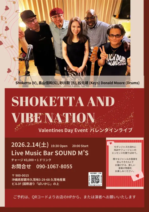 ★Shoketta and Vibe Nation・開場:19時30分/開演:20時・MEMBER=Shoketta (Vocal)、島山信和 (Guitar)、砂川聡 (Bass)、松元 靖 (Key)、Donald Moore (Drums)・会場=Live Music Bar SOUND M’S