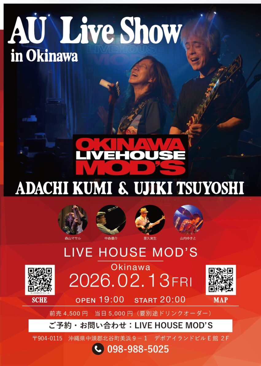 ★AU Live Show in Okinawa・開場:19時/開演:20時・出演=ADACHI KUMI & UJIKI TSUYOSHI、森山マサル、中森優介、里久夹生、山内ゆきと・会場=LIVE HOUSE MOD’S