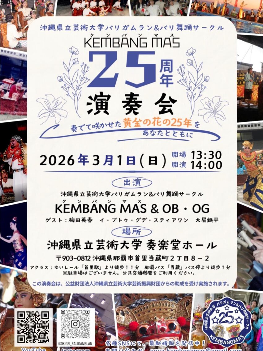 ★クンバンマス25周年演奏会 ~奏でて咲かせた黄金の花の25年をあなたとともに~・開場:13時30分/開演:14時・出演=沖縄県立芸術大学バリガムラン&バリ舞踊サークル、KEMBANG MAS & OB · OG・ゲスト:梅田英春、イ·プトゥ·グデ·スティアワン、大眉鉄平・会場=沖縄県立芸術大学奏楽堂ホール