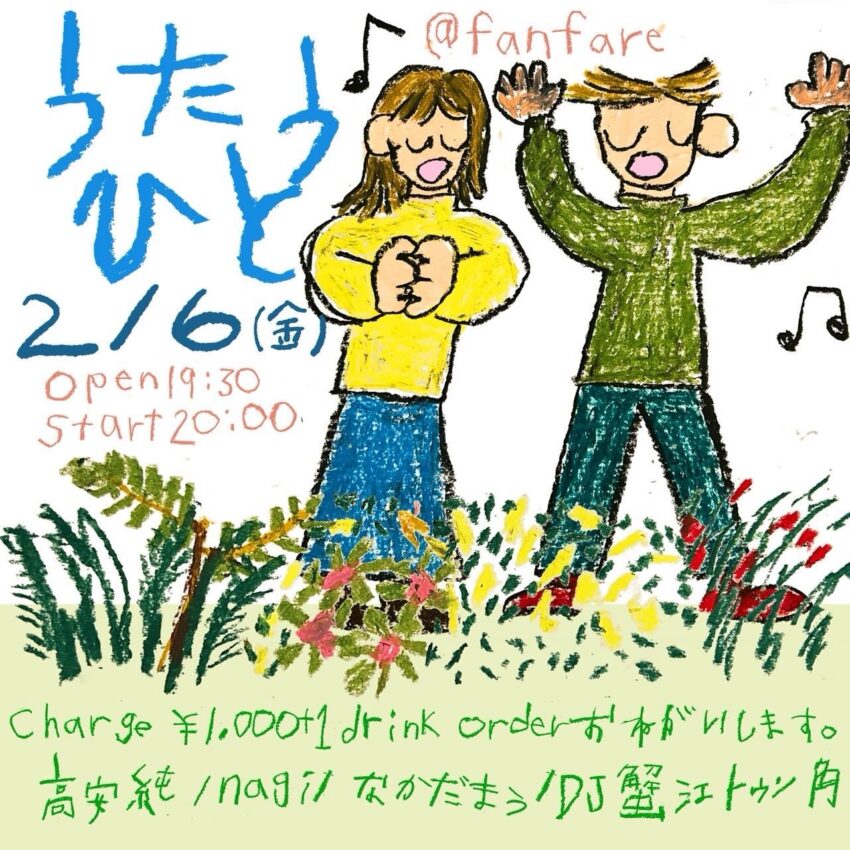 ★うたうひと・開場:19時30分/開演:20時・出演=高安純、nagil、なかだまう・DJ:蟹江トゥン角・会場=AZAT FANFARE