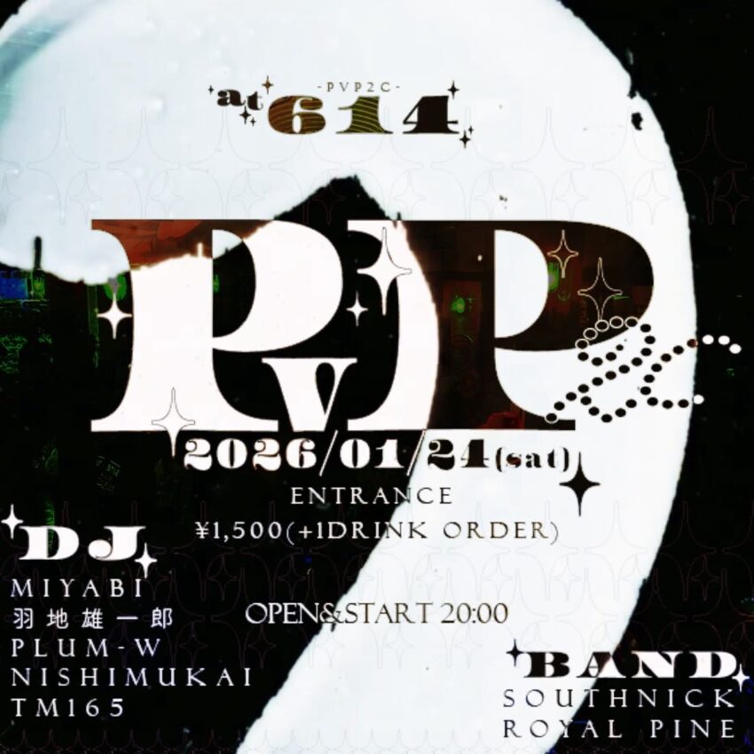 ★~ PvP2c ~at.614・開場:20時/開演:20時・BAND=SouthNick、Royal Pine・DJ:MIYABI、羽地雄一郎、plum-w、Nishimukai、tm165・会場=Crossover Cafe 614(沖縄市中央1-17-15・2階)