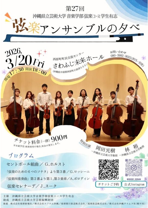★沖縄県立芸術大学音楽学部弦楽コース学生有志・弦楽アンサンブルの夕べ・開場:17時30分/開演:18時・会場=さわふじ未来ホール(西原町小波津555)