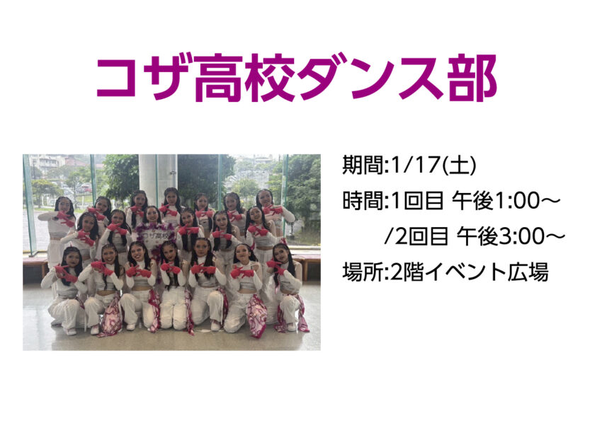 ★コザ高校ダンス部・【1回目】開演:13時~・【2回目】開演:15時~・会場=イオン具志川店・2階イベント広場