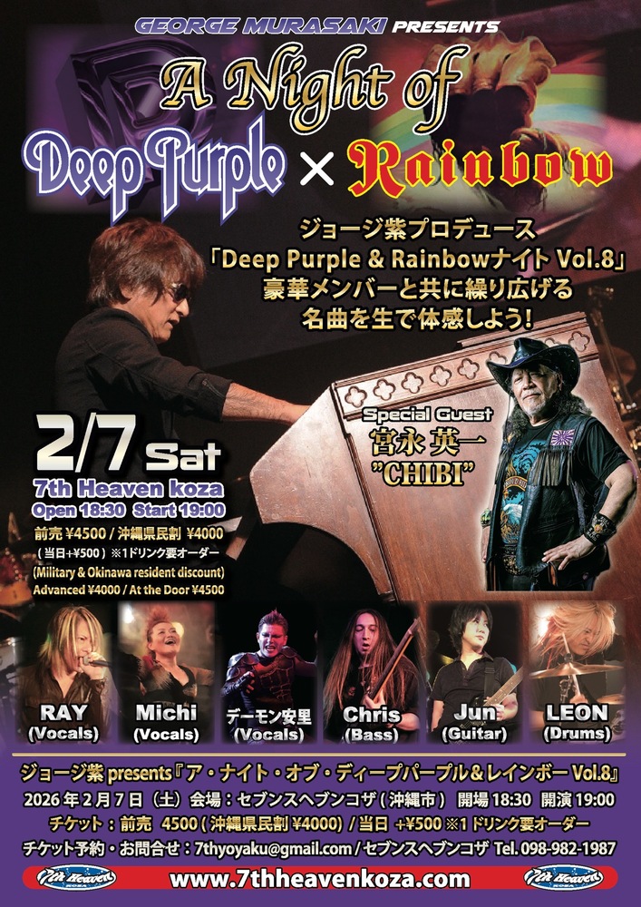 ★Deep Purple & Rainbow Night Vol.7・開場:18時30分/開演:19時・出演=ジョージ紫(Key)、宮永英一(Vo)、Chris(Ba)、LEON(Dr)、JUN(Gt)、RAY(Vo)、Michi(Vo)、Yuki(Vo)・会場=7th Heaven Koza