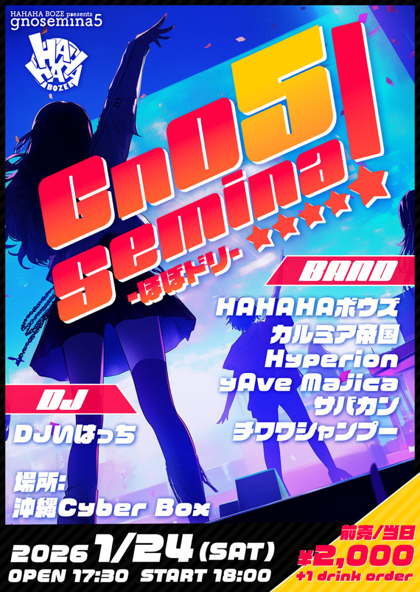 ★HAHAHA BOZE presents gnosemina5・開場:17時30分/開演:18時・BAND:HAHAHAボウズ、カルラア帝国、Hyperion、SAve Majica、サバカン、チワワシャンプー・会場=Cyber-Box