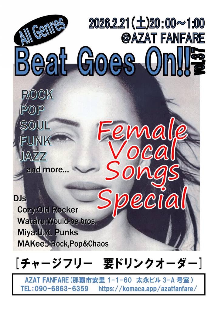 ★DJ EVENT Beat Goes On!! vol.37 Female Vocal Song Special・開演:20時~25時・DJs =Cozy:Old Rocker、Wataru:Would-be bro.、Miya:U.k.Punks、MAKee:J-Rock.Pop&Chaos・会場=AZAT FANFARE