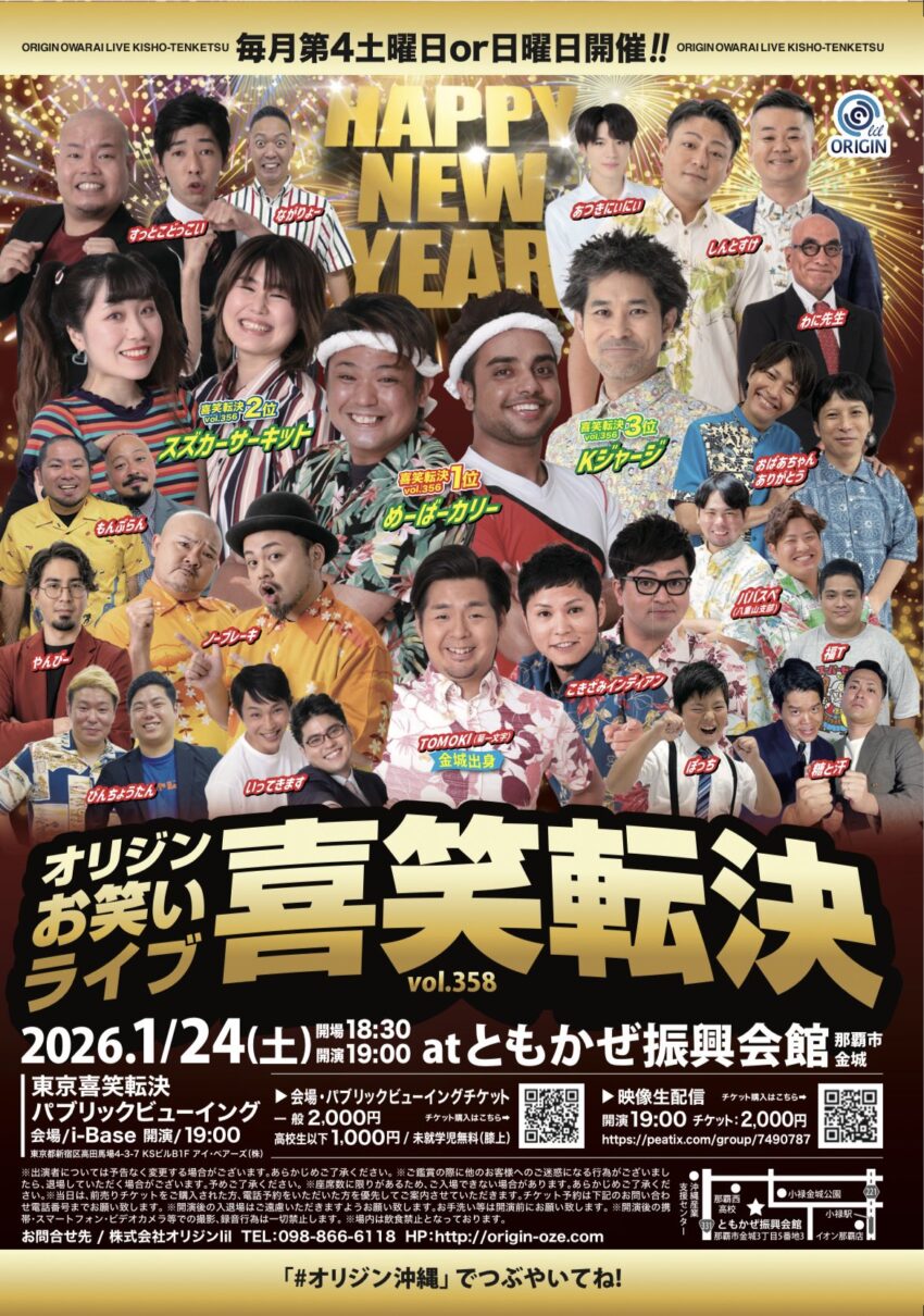 ★オリジンお笑いライブ 喜笑転決 vol.358・開場:18時30分/開演:19時・会場=ともかぜ振興会館(那覇市金城3丁目5番地3)