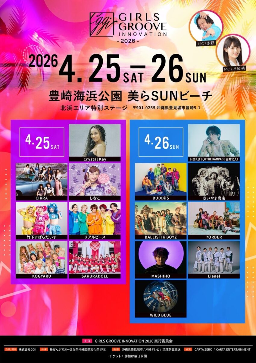 ★GIRLS GROOVE INNOVATION 2026・時間後日発表・総合MC 永野 / 谷尻萌・出演=HOKUTO / BUDDiiS / きいやま商店 / BALLISTIK BOYZ / 7ORDER / MASHIHO / Lienel / WILD BLUE ・会場=豊崎海浜公園 美らSUNビーチ・北浜エリア特別ステージ