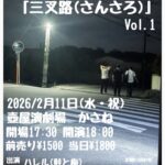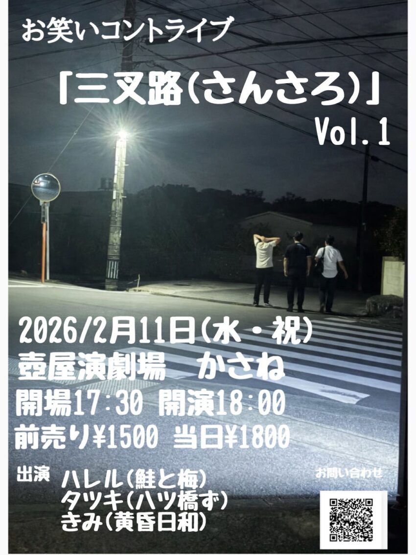 ★お笑いコントライブ「三叉路(さんさろ)」Vol.1・開場:17時30分/開演:18時・出演=ハレル(鮭と梅)、タツキ(八ツ橋ず)、きみ(黄昏日和) ・会場=壺屋演劇場かさね