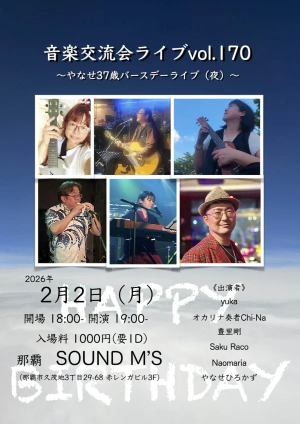 ★〜やなせ37歳バースデーライブ(夜)〜音楽交流会ライブvol.170・開場:18時/開演:19時・MEMBER=O.A.yuka:ウクレレ弾き語り)、1.オカリナ奏者Chi-Na:(オカリナ演奏)、2.豊里剛:ギター弾き語り、3.Saku Raco :ピアノ&ウクレレ弾き語り、4.Naomaria :ウクレレ弾き語り、5.やなせひろかず:ギター弾き語り・会場=Live Music Bar SOUND M’S