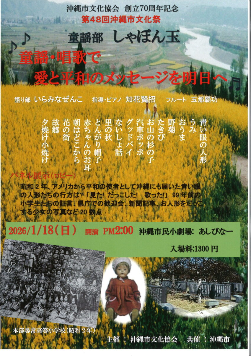 ★沖縄市文化協会 創立70周年記念 第48回沖縄市文化祭♪童謡部 しゃぼん玉・開場:13時30分/開演:14時・語り部:いらみなぜんこ・ 指導·ピアノ:知花賢招・フルート・玉那覇功・会場=沖縄市民小劇場あしびなー