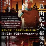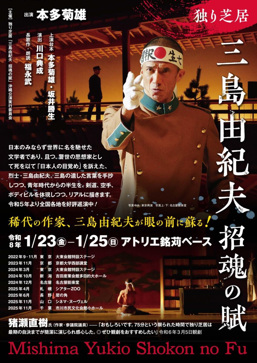 ★独り芝居『三島由紀夫 招魂の賦』・【昼公演】開場:13時30分/開演:14時・【夜公演】開場:18時/開演:18時30分・長歌作・朗読:福永武・会場=アトリエ銘苅ベース
