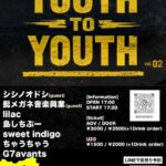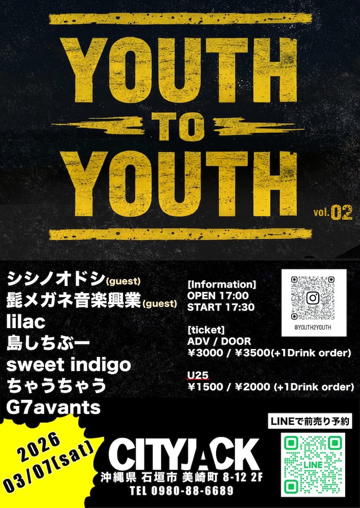 ★youth to youth vol.02・開場:17時/開演:17時30分・出演=シシノオドシ (Guest)、髭メガネ音楽興業 (Guest)、lilac、島しちぶー、sweet indigo、ちゃうちゃう、G7avants・会場=石垣島・MUSIC & PUB CITY JACK