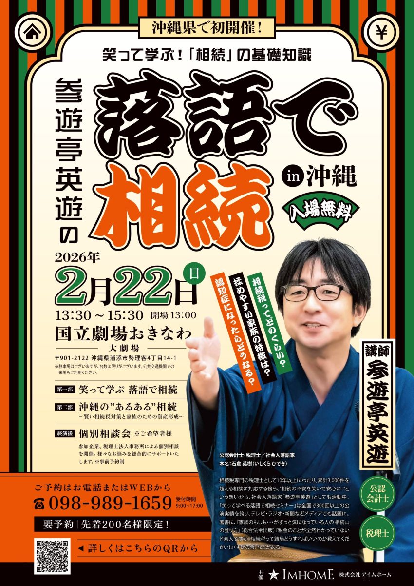 ★沖縄初開催!笑って学ぶ!「相続」の基礎知識 「落語で相続 in 沖縄」・開場:13時/開演:13時30分~終演:15時30分・出演=公認会計士・税理士/社会人落語家「参遊亭英遊」・会場=国立劇場おきなわ・大劇場