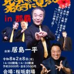 ッポ~♪あなたの肩越しに~・【1回目】開場:11時/開演:12時・【2回目】開場:15時/開演:16時・出演者=間寛平、辻本茂雄、やなぎ浩二、未知やすえ、島田珠代、諸見里大介、多和田上人、けんたくん、おやどまり・会場=沖縄コンベンションセンター劇場棟