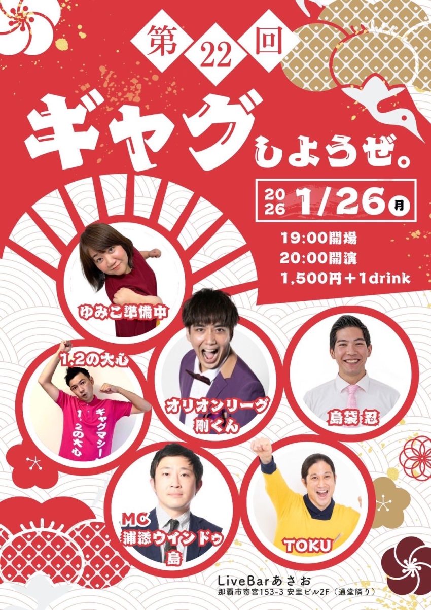 ★第22回 ギャグしようせ・開場:19時/開演:20時・出演=ゆみこ準備中、1.2の大心、オリオンリーグ剛くん、島袋忍、TOKU・MC:浦添ウインドゥ島・会場=LIVE BAR あさお